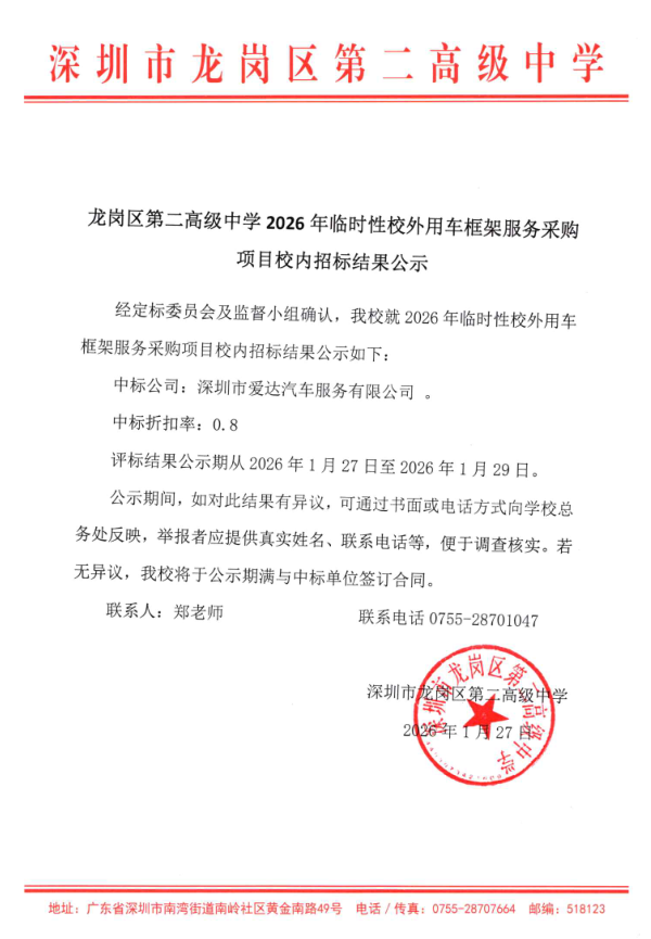 龙岗区第二高级中学2026年临时性校外用车框架服务采购项目校内招标结果公示
