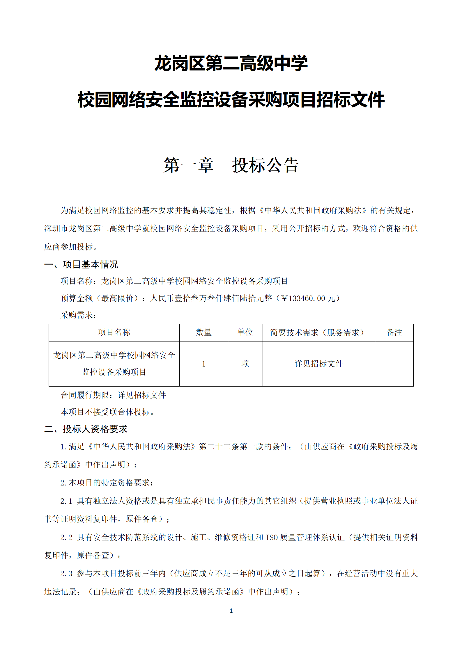 龙岗区第二高级中学校园网络安全监控设备采购项目招标文件