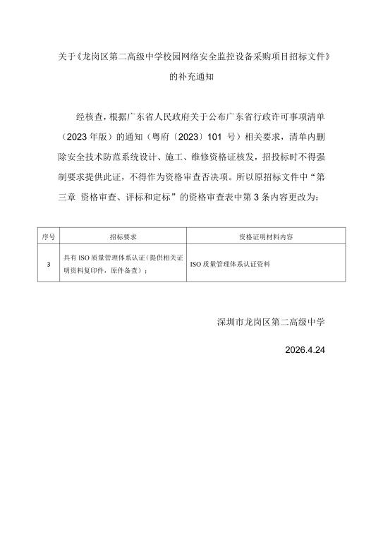 关于《龙岗区第二高级中学校园网络安全监控设备采购项目招标文件》的补充通知