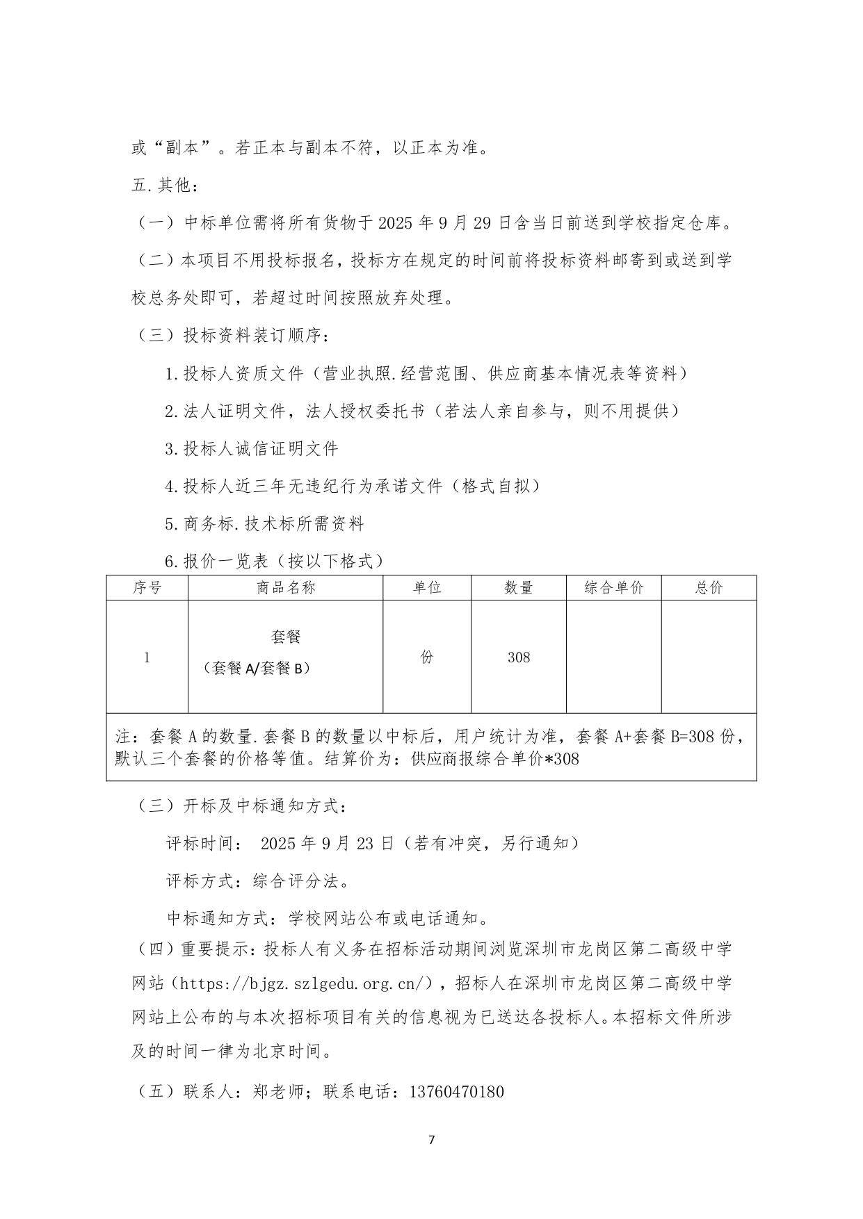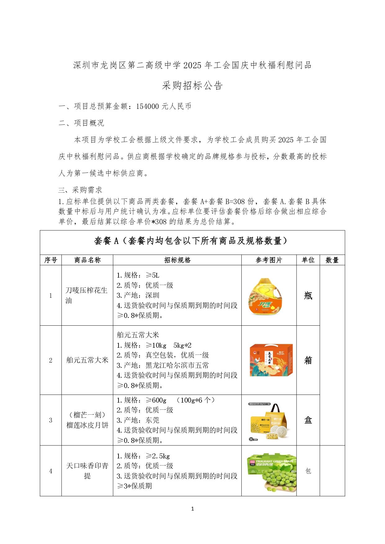 深圳市龙岗区第二高级中学2025年工会国庆中秋福利慰问品采购招标公告