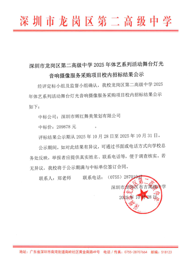 深圳市龙岗区第二高级中学2025年体艺系列活动舞台灯光音响摄像服务采购项目校内招标结果公示