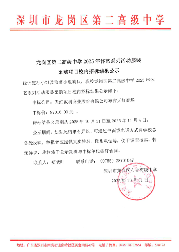 龙岗区第二高级中学2025年体艺系列活动服装采购项目校内招标结果公示